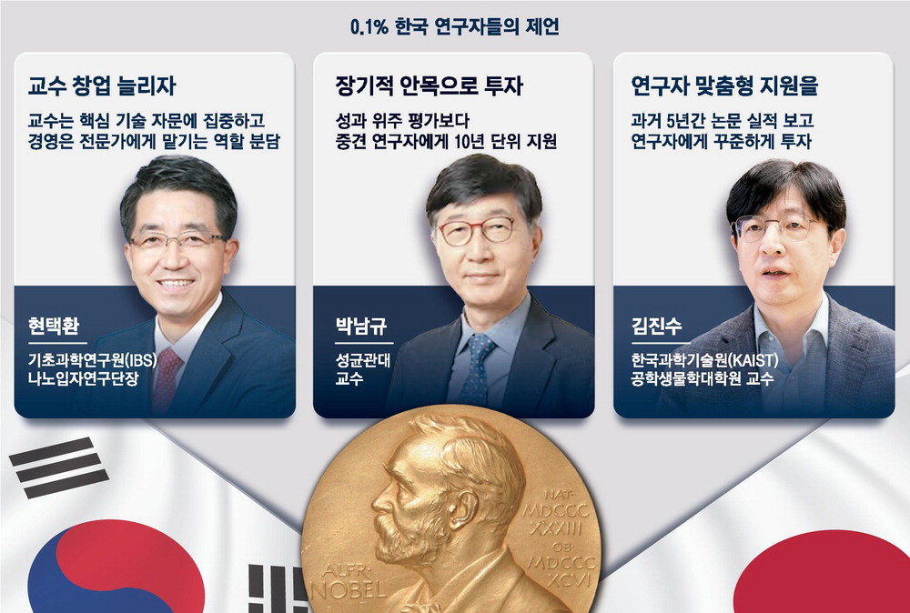 인재들을 끌어모으려면 우리 사회의 과학을 대하는 자세가 달라져야 한다는 게 석학들의 공통된 지적이다. 박남규 교수는 "우리나라는 기초과학에 본격적으로 투자한 것도 10년에 불과하다"며 "아직 기다림이 필요하다"고 강조했다. 박 교수는 "'왜 우리는 (노벨상을) 못 받나' 다그치기보다 '곧 나올 것'이라고 격려해주면 좋겠다. 격려와 칭찬이 연구자들을 춤추게 할 것"이라고 말했다. 김진수 교수도 "일본의 저력은 우리보다 60~70년 앞선 투자에서 비롯됐고,지금의 성과는 일본 경제가 호황이던 30~40년 전 투자한 결실"이라고 강조했다.