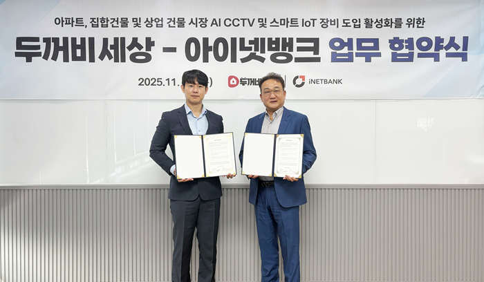 < ㈜두꺼비세상과 ㈜아이넷뱅크가 11월 3일 두꺼비세상 본사에서 ‘AI CCTV 및 스마트 IoT 장비 도입 활성화를 위한 업무 협약(MOU)’을 체결하고 기념촬영을 하고 있다. (좌측부터) ㈜두꺼비세상 유광연 대표,㈜아이넷뱅크 유고명 사장 /사진 제공 : ㈜두꺼비세상 > 스마트 공간관리 프롭테크 기업 ㈜두꺼비세상(대표 유광연)이 AI 기반 스마트 보안 솔루션 도입을 통해 주거·오피스·상업시설 전반의 안전 관리 수준을 한 단계 높이고 국내 생활공간 보안 시장 통합 생태계를 선도한다.