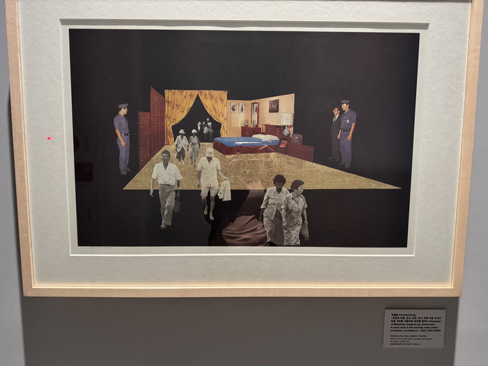 서울시립 사진미술관에서 전시 중인 박불똥의 ‘경찰의 보호,감시,보호,감시 아래 서울 강서구 목동 주민들 이른아침 일터를 향하다’(1985) <정유정 기자> 박불똥의 ‘경찰의 보호,감시 아래 서울 강서구 목동 주민들 이른아침 일터를 향하다’(1985)도 눈에 띈다. 그는 자신의 작품에 ‘리프로덕티브 오리지널’이라는 개념을 제시하며 사진 매체의 복제성과 원본성 문제를 탐구했다.
