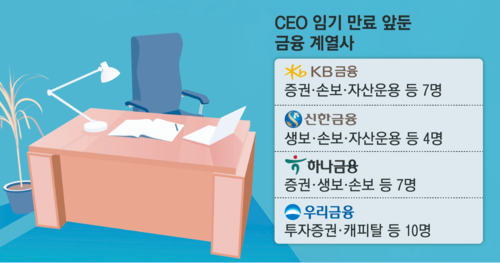 30일 금융권에 따르면 올해 말 임기가 만료되는 CEO는 5대 지주 계열사 64곳 중 28명으로 44%에 달한다. KB금융그룹이 계열사 11곳 중 7명,신한금융이 14곳 중 4명,하나금융이 14곳 중 7명,우리금융이 16곳 중 10명이다. 농협금융은 올해 임기가 만료되는 CEO가 없다.