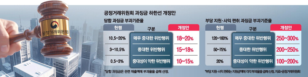 과징금 상향은 정부의 물가 잡기 총력 대응 기조에 따라 제재의 실효성을 높이자는 취지에서 이뤄졌다. 이재명 대통령은 지난달 국무회의에서 생활 물가 담합과 관련해 "담합 규모에 비해 과징금이 너무 적다"며 제도 보완 필요성을 지적했다. 이후 주병기 공정위원장은 국회 정무위원회에서 "상당히 높은 (과징금) 하한을 중대한 위반 행위에 대해 둘 수 있게 할 것"이라고 밝혔다. 공정위는 부당 지원,특수관계인에 대한 부당한 이익 제공 관련 과징금 부과율을 최대 5배 늘리기로 했다. 이에 따라 지원 금액 또는 제공 금액에 부과기준율을 곱한 금액을 기초로 산정되는 과징금 하한을 현행 20%에서 100%로 상향할 계획이다. 매우 중대한 위반 행위에 따른 과징금 상한도 현행 160%에서 300%로 2배 가까이 높이기로 했다.