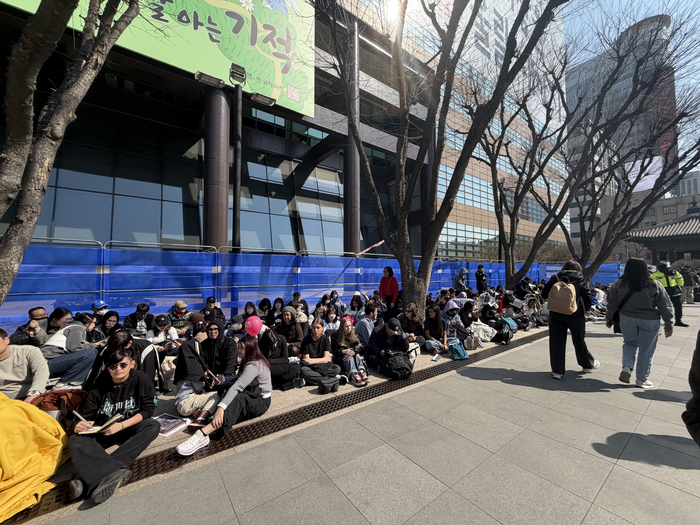 광화문 교보생명빌딩 앞에 자리를 잡은 팬들 / 사진= 문서연 여행+ 기자 공연 당일 오후 2시,광화문역 무정차의 마지막 열차를 탔다. 내리자마자 시작한 짐 검사는 광화문 일대에 들어가는 모든 사람이 대상이었다. 줄은 길었지만 대기 시간은 생각보다 짧았다. 경찰들이 엄청난 속도로 빠르게 검사를 진행했다.