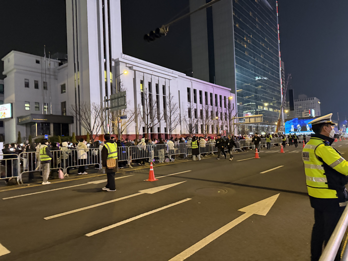 상대적으로 한산한 티켓존 / 사진= 문서연 여행+ 기자 무대에서 한참 떨어진 광화문역 뒤편에서는 스크린을 확보하려는 움직임이 이어졌다. 티켓 구역 바로 옆 펜스에는 사람들이 가득 붙어 있었고 경찰은 “이동해 주세요,멈춰 있는 공간이 아닙니다”를 반복해 외쳤다.