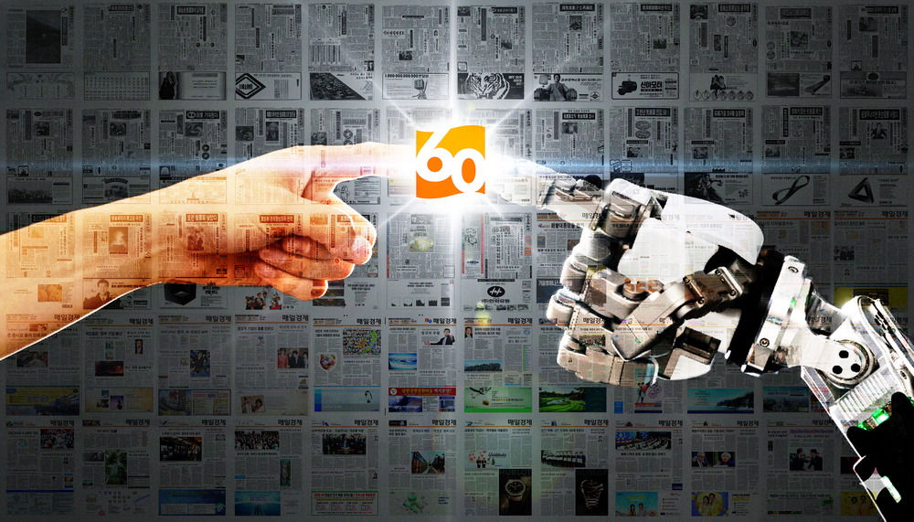 지난 60년 동안 매일경제는 한국을 명실상부한 선진국 반열에 올려놓기 위해 산업 변화를 추적하고,국가적 어젠다를 꾸준히 제시해 왔습니다. 사진은 인공지능(AI)을 모국어처럼 사용하는 나라를 만들자는 슬로건인 'AI 네이티브 코리아'를 표현하기 위해 국내 스타트업 테솔로가 만든 로봇 그리퍼와 개발자의 손가락이 마주치는 장면을 연출한 것입니다. 배경에는 1966년 3월 24일 자 창간호부터 같은 날짜 1면 60장을 오롯이 담았습니다. 매일경제 사진부