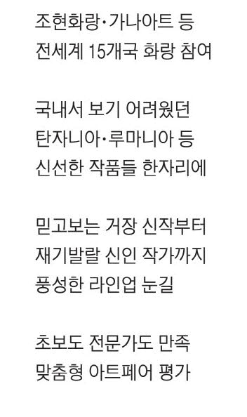 "대형 상업 아트페어의 대안이자 실험 정신이 강한 아트페어인 만큼 그간의 불문율을 깨고 조각을 걸려고 합니다."(일본 '미사코&로젠' 제프리 로젠 대표)