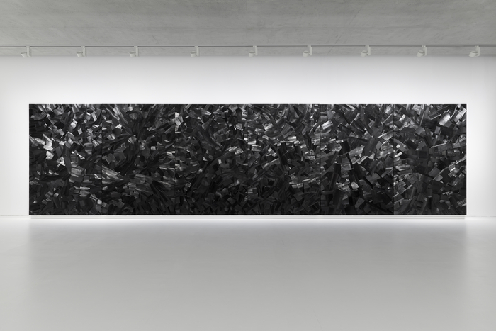 숯 조각을 캔버스에 빼곡히 붙인 이배의 ‘불로부터’ <뮤지엄산> 블랙 공간에는 숯덩어리를 쌓아 올린 조형물과 바닥 드로잉이 이어진다. 그는 “숯 덩어리는 고향 산의 숲과 같다”고 설명했다. 숯 조각을 캔버스에 빼곡히 붙인 ‘불로부터’ 연작 중 가로 길이가 2m 60cm에 달하는 대형 작품도 함께 전시된다.