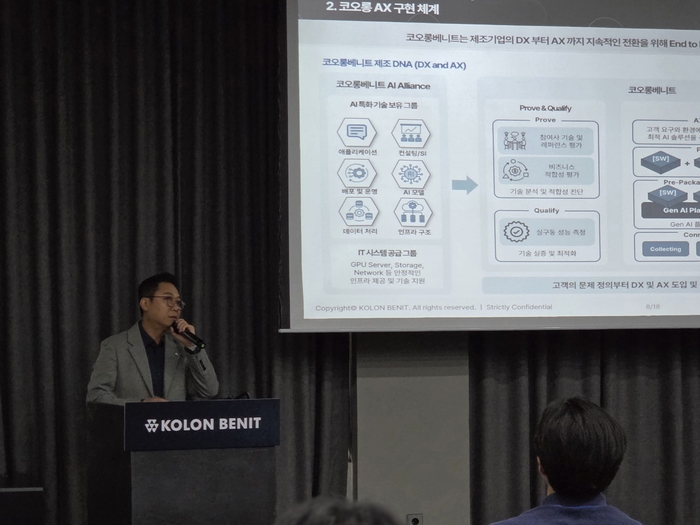 20일 강재훈 코오롱베니트 AX커머스팀장이 로드쇼 세미나에서 발표하고 있다. 코오롱베니트. 코오롱베니트가 지역 제조기업을 직접 찾아가 인공지능 전환(AX) 적용 방안을 소개하는 로드쇼를 열었다. 주요 내용은 제조 현장에서 AI가 개념검증(PoC)에 머무르지 않기 위한 전략이었다.