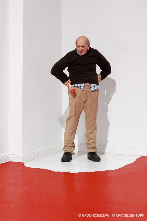 사회 현상을 풍자한 작품도 눈길을 끈다. '시대정신'은 붉은 페인트를 칠하다 스스로 구석에 몰린 노인의 모습을 극사실적인 조각으로 묘사한다. 자신이 만든 문제로 벼랑 끝에 내몰린 형상은 정치,기후 위기 등 다양한 사회적 맥락으로 해석할 수 있다.