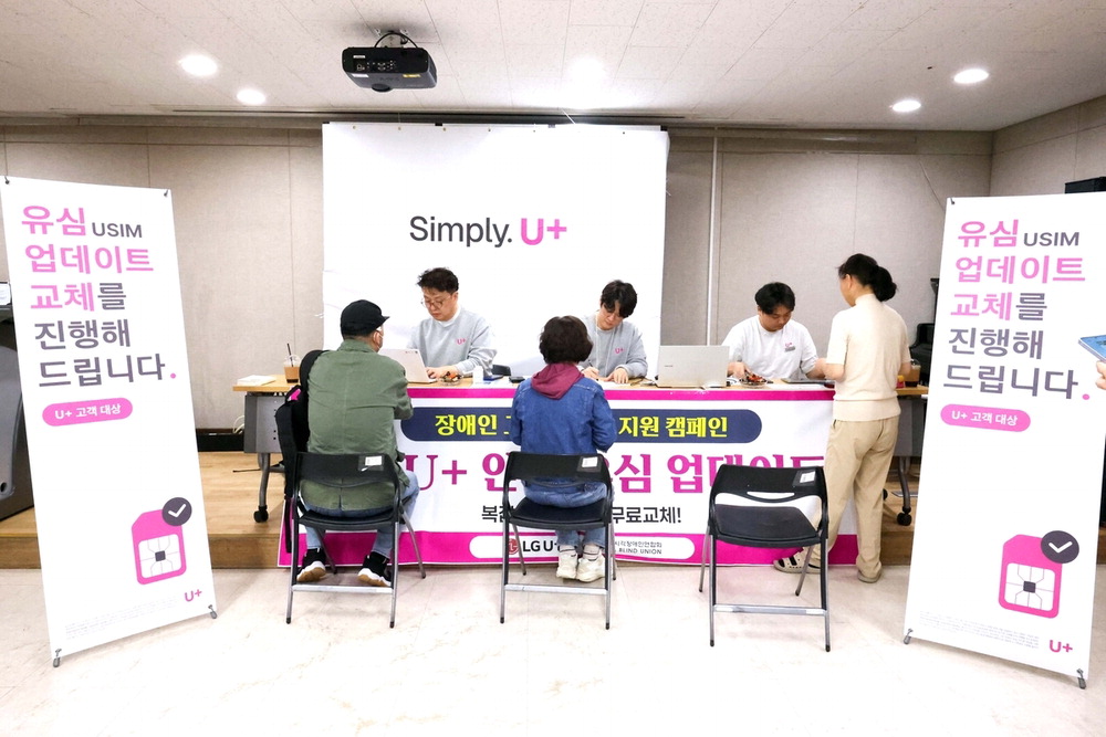 LG유플러스는가 지난 13일부터 22일까지 유심(USIM) 업데이트와 무료 교체 누적 건수가 열흘 만에 100만건을 넘어섰다고 23일 밝혔다. 22일 서울 노원시각장애인복지관에서 유심 교체 작업을 진행하는 모습. LG유플러스